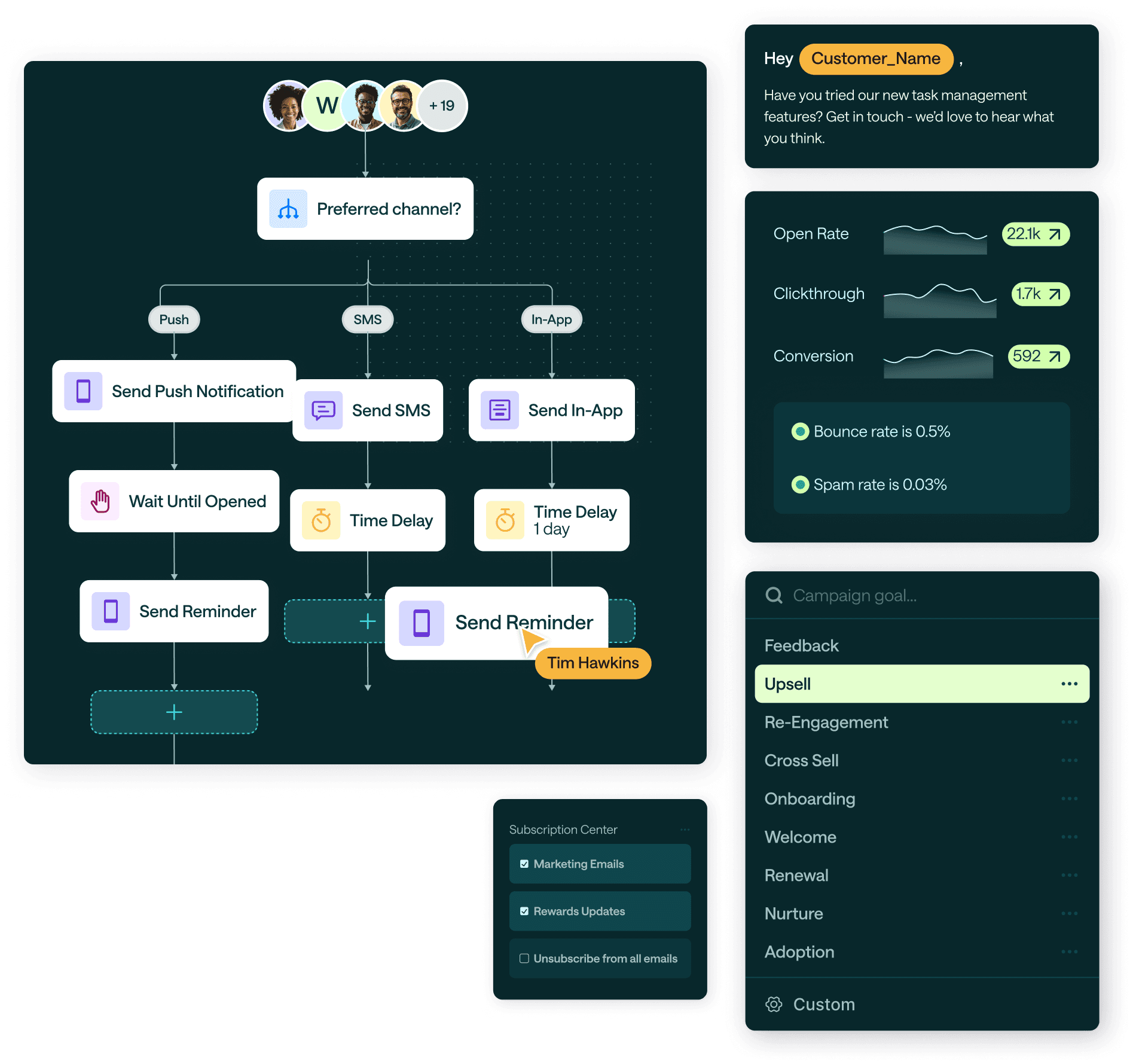 Create campaigns aligned with key user behaviors in your product or app. Engage with the perfect mix of email, push, in-app, and SMS.