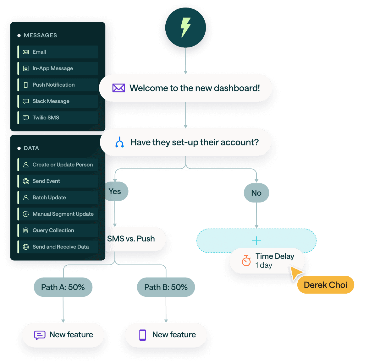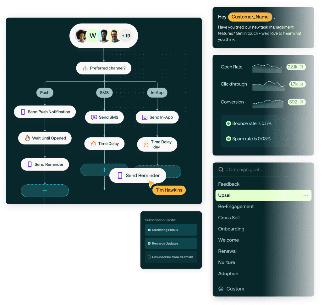 • Build intricate, multi-step customer journeys all within one intuitive drag-and-drop workflow builder. • Create engaging customer experiences without needing support from technical teams.