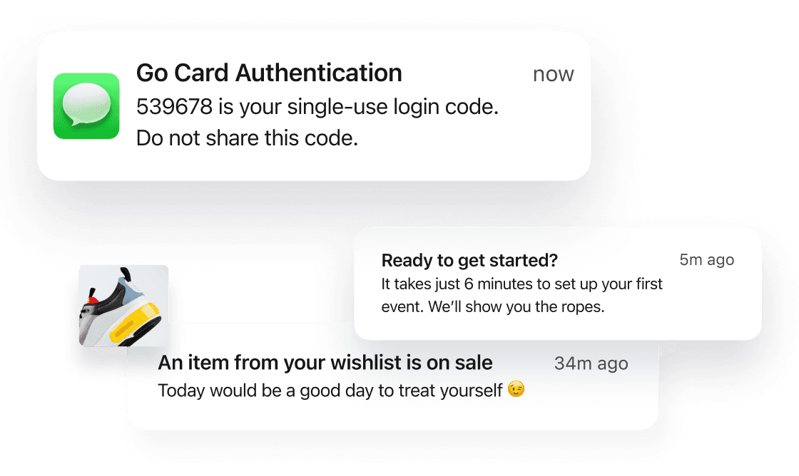 Send messages to your audience through emails, push notifications, in-app messages, and SMS.