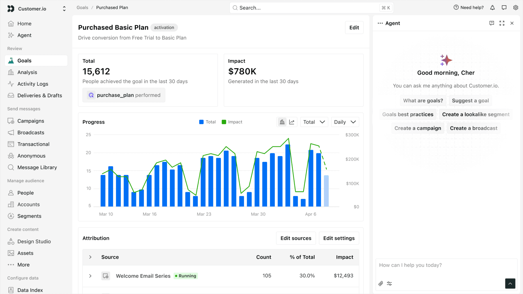 Build and optimize cross-channel workflows from a conversation, with logic the Agent configures for you.